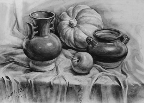 在素描繪畫中線條是最基礎的語言,比線條更進一步的就是筆觸,而對于不同質感的靜物的表現重點就依靠不同的筆觸去完成。例如,不銹鋼制品、陶瓷器,玻璃等,質感緊湊而堅硬,有些甚至還要注意特殊的質感表現比如光滑、反光、透明等;表現松軟物體如毛線制品、棉花制品等,則要表現出柔軟透氣的一面,這時筆觸就不能太過密集。學習表現不同物體的質感,可以豐富表現技巧,提高素描造型能力。但由于素描工具的局限性,只能要求質感的相對真實。