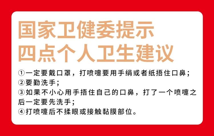 打噴嚏或咳嗽時,不要直接用手捂住口鼻,正確做法是使用紙巾或彎曲手肘掩蓋口鼻。用過的紙巾應丟棄在有害垃圾箱內,然后徹底清洗雙手。