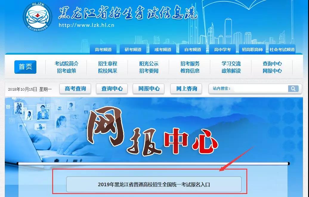 考生登錄黑龍江省招生考試信息港(www.lzk.hl.cn)后,進入網報中心,點擊2019年黑龍江省普通高校招生全國統一考試報名入口: