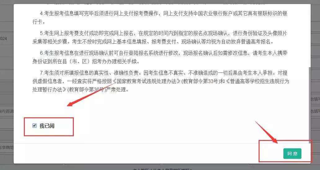 認真查看考生網上報名必讀,并將頁面拉至底部后,勾選“我已閱”選項,同時選擇同意。