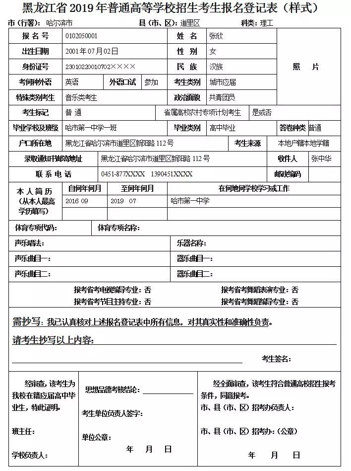 4.進城務工人員隨遷子女參加我省高考報名,需填寫《黑龍江省2019年進城務工人員子女參加高考報名資格審查表》。報名確認時,考生須出具父母在我省合法職業和合法穩定住所(含租賃)的相關證明;考生所就讀的高級中學校長、班主任負責審核確認考生連續實際就讀情況并簽字負責,考生所在縣(市、區)招考辦負責審核考生學籍、考生家長合法職業和合法穩定住所;