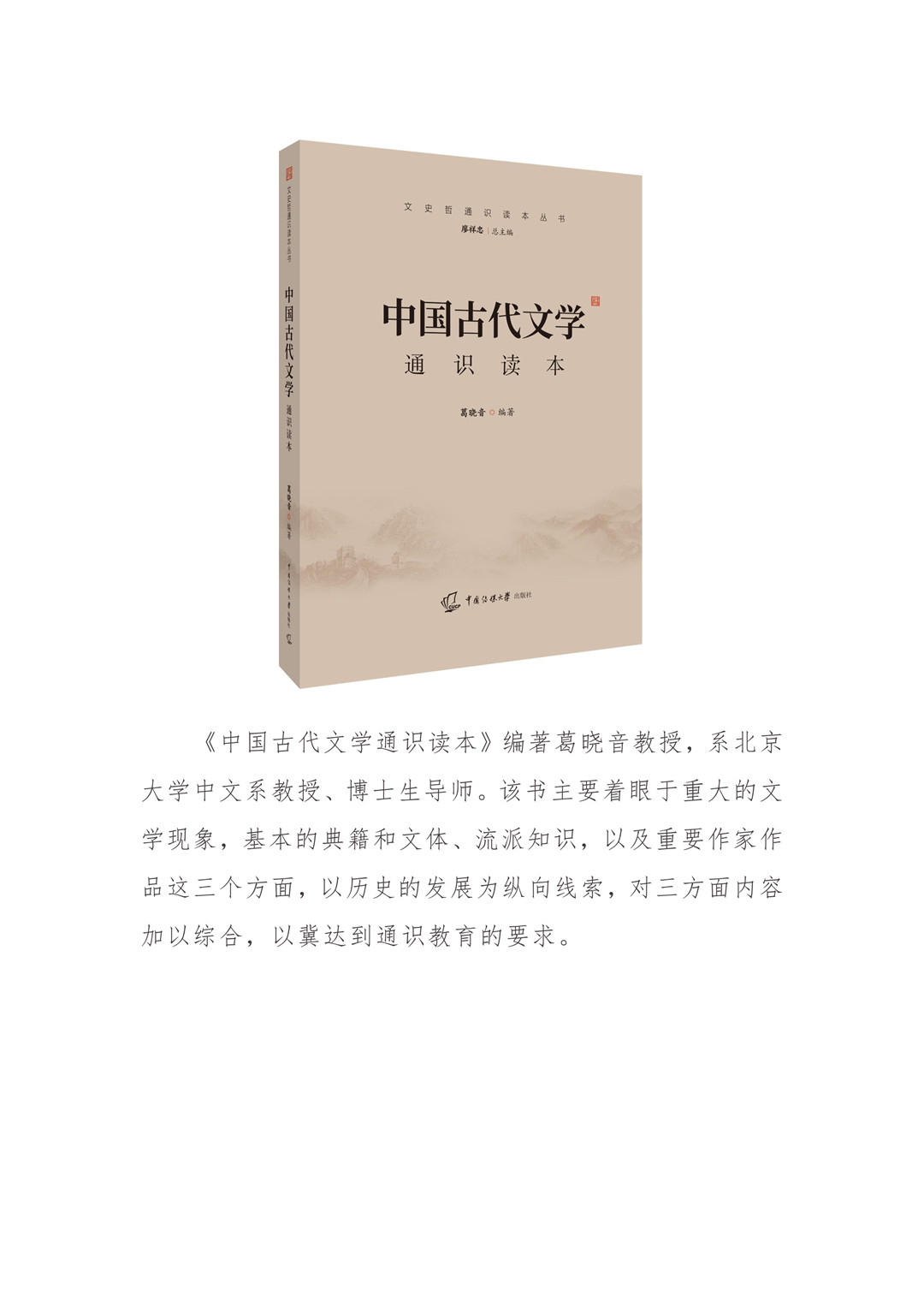 《中國古代文學通識讀本》編著葛曉音教授,系北京大學中文系教授、博士生導師。該書主要著眼于重大的文學現象,基本的典籍和文體、流派知識,以及重要作家作品這三個方面,以歷史的發展為縱向線索,對三方面內容加以綜合,以冀達到通識教育的要求。
