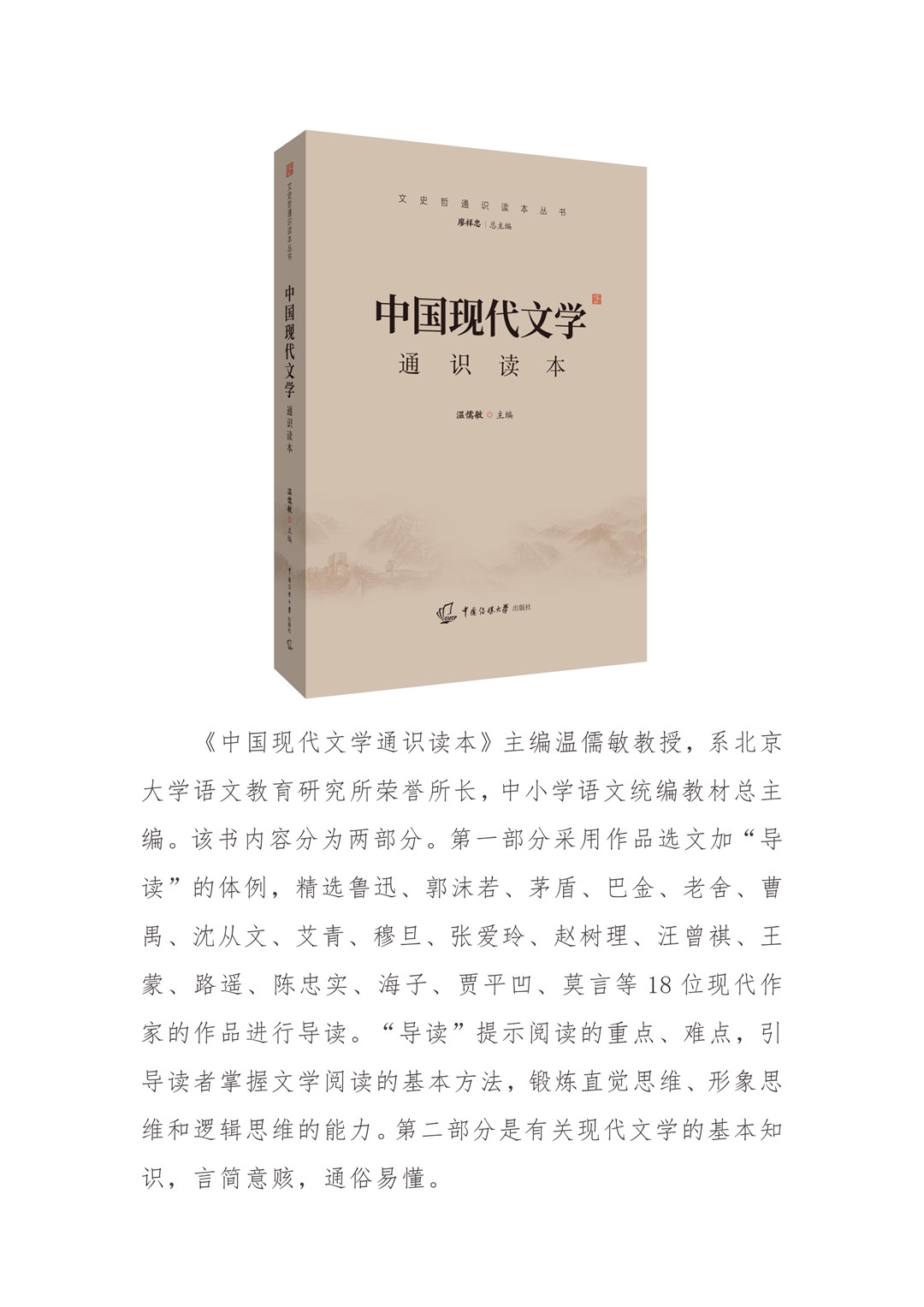 《中國現代文學通識讀本》主編溫儒敏教授,系北京大學語文教育研究所榮譽所長,中小學語文統編教材總主編。該書內容分為兩部分。第一部分采用作品選文加“導讀”的體例,精選魯迅、郭沫若、茅盾、巴金、老舍、曹禺、沈從文、艾青、穆旦、張愛玲、趙樹理、汪曾祺、王蒙、路遙、陳忠實、海子、賈平凹、莫言等18位現代作家的作品進行導讀。“導讀”提示閱讀的重點、難點,引導讀者掌握文學閱讀的基本方法,鍛煉直覺思維、形象思維和邏輯思維的能力。第二部分是有關現代文學的基本知識,言簡意賅,通俗易懂。