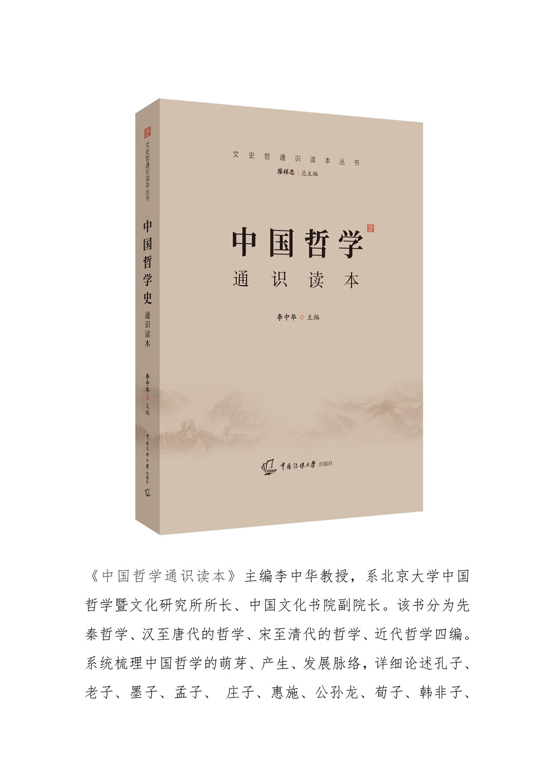 《中國哲學通識讀本》主編李中華教授,系北京大學中國哲學暨文化研究所所長、中國文化書院副院長。該書分為先秦哲學、漢至唐代的哲學、宋至清代的哲學、近代哲學四編。系統梳理中國哲學的萌芽、產生、發展脈絡,詳細論述孔子、老子、墨子、孟子、 莊子、惠施、公孫龍、荀子、韓非子、董仲舒、揚雄、王充、何晏、王弼、阮籍、嵇康、裴頠、郭象、韓愈、李翱、柳宗元、劉禹錫、 周敦頤、張載、程顥、程頤、朱熹、陸九淵、陳亮、葉適、王陽明、李贄、黃宗羲、方以智、王夫之、顏元、李塨、戴震、龔自珍、魏源、康有為、譚嗣同、梁啟超、嚴復、章太炎、孫中山等人的哲學思想。