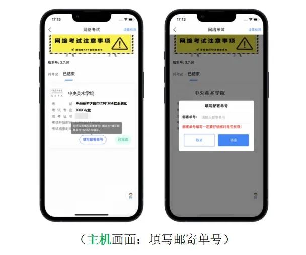 考生按要求將試卷通過中國郵政特快專遞寄出后,登錄主機“藝術升”APP,點擊【網絡考試】,選擇對應考試【填寫郵寄單號】。確保輸入的郵寄單號無誤后再點擊【確定】。至此,當科考試所有步驟均已完成。