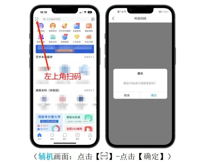 2.輔機掃碼:使用輔機打開“藝術升”APP(無需登錄賬號),點擊【首頁】左上角掃描功能按鈕,掃描主機頁面顯示的二維碼直接進入直播考場,將輔機固定在輔機位手機支架上。若輔機未成功進入監控狀態,則無法進行考試。