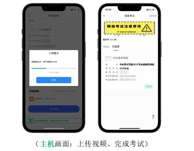 考生完成試卷封裝展示后,在主機點擊【提交視頻】按系統提示時間提交本地錄制的考試視頻。視頻上傳成功前,請勿退出藝術升APP,切忌卸載!